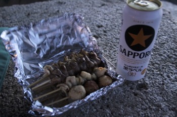 ここの焼き鳥屋さん、注文を受けてから、その場で焼いてくれるので、店の中の机で待ってる。