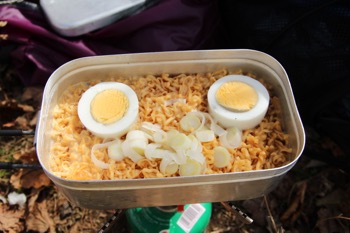 チキンラーメンは煮込みすぎると麺が延びる。あっと言うまに調理が完了。