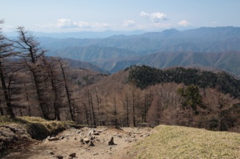 下に奥多摩小屋のテン場。その向こうに七ツ石山が見えます。