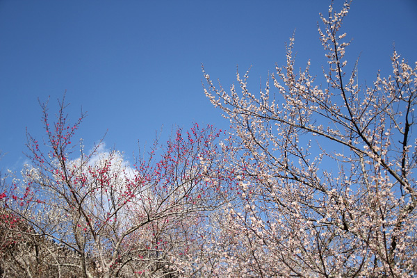 青い空に、薄紅色の梅が綺麗です。