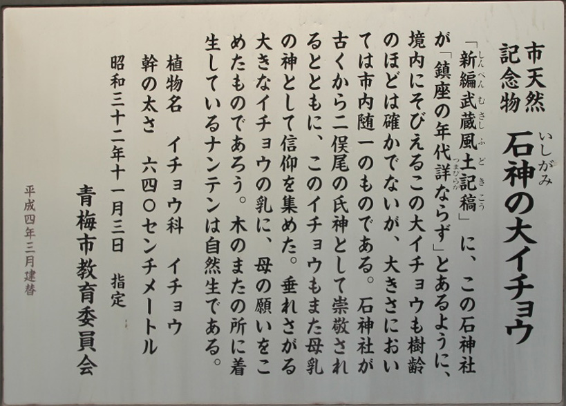 市の天然記念物『石神の大イチョウ』と書いていました。