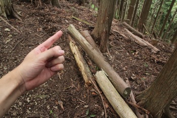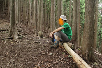 急坂を下って行くと、平らな場所が出来てきまして、そこで倒木に腰をかけて休みました。