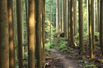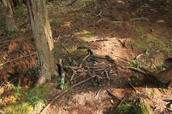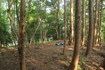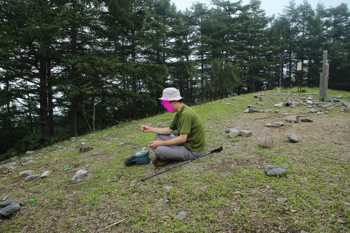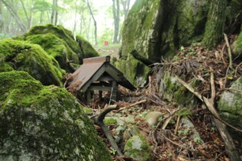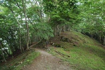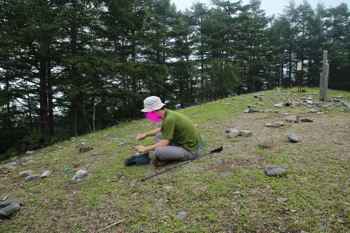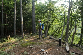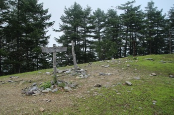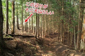 しばらく進むと道標があり、道は下降を初めますが、この道標の裏側に平な場所があり、そこが十二天山でした。