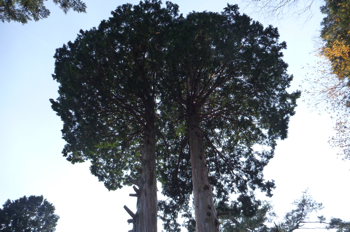 ふくよかなコブがある方が「女杉」、もう片方が「男杉」と言われて、 この二本がつながり合って、仲睦まじく立っている姿から、夫婦杉と言われています。