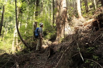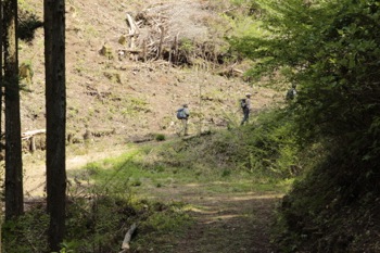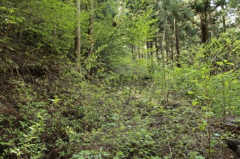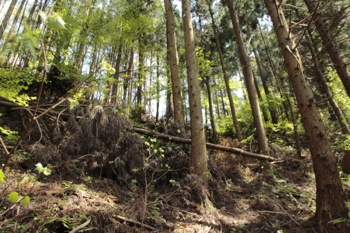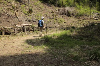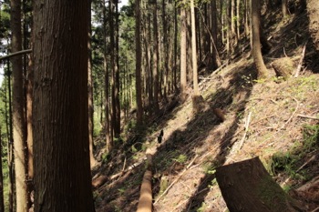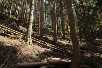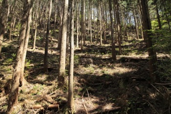 とりあえず、斜面の基部にとりつく、ここはしっかり踏んだ後がある。 林業の人が踏んだ跡だろう。
