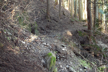 細くて暗い杉の森を歩くと、水場を発見!!