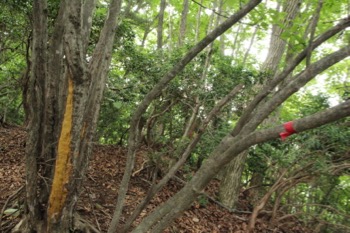 しかし下る方角にも黄色や赤のテープが巻いてありました。