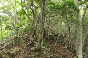 地図で見ると、向フ山からエビ小屋山の間は尾根の幅が狭く、左右が切れ落ちている様な道が多いのかと思っていたけど、そういう場所はほとんどない。