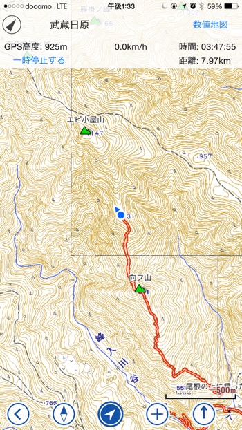 さて、ここからですが、もう帰りたいと思うのですが、このまま下山というわけにはいかないので、ここから更に標高をあげて『海老小屋山』を目指し、一般登山道へと合流し下山します。