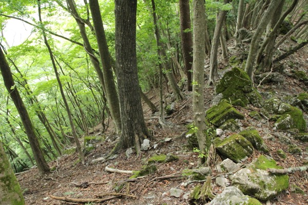 この場所。右側の緩やかな斜面側に踏み跡があるので、そこを歩いてゆきます。