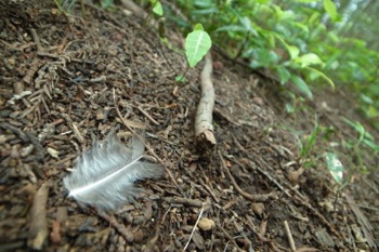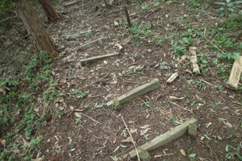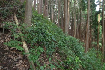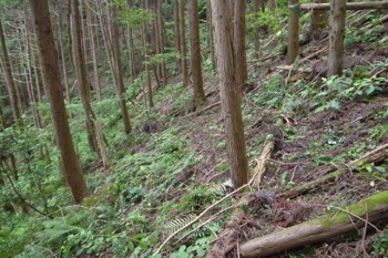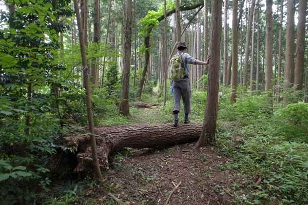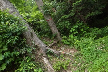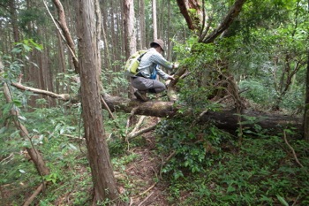 三室山の直前では、山腹を横断気味に進み、倒木の巣。