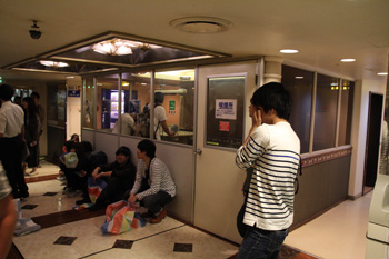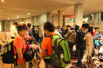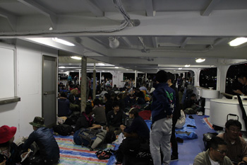 船内のあちこちで、人が寝転がっております。席無し券で溢れています。