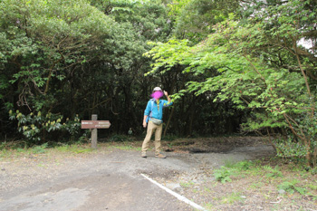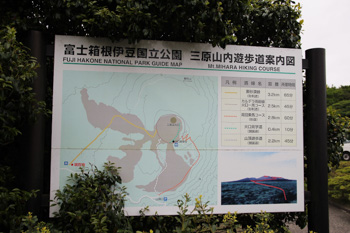 登山口は大島温泉ホテルに向かって右側にあります。『三原山内遊歩道案内図』の看板が立っていますし、つつじ園への看板も立っている場所が入口です。