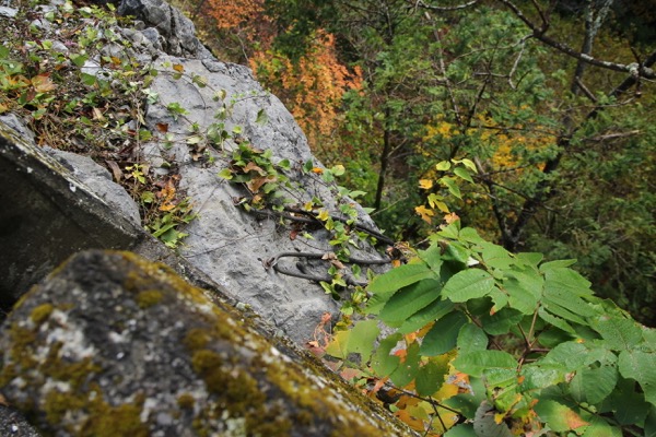 この岩の右下は崖になっていますが、下を何気なく覗くと、ロッククライミングの跡が残っていました。