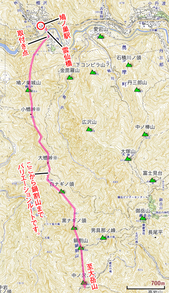 ちなみに今回、大岳山に至るアプローチとして、御岳山経由ではなく鳩ノ巣城山、鍋割山北尾根経由を選択してみました。