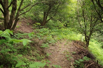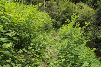 そして小屋を過ぎて道なりに歩くと、樹林帯を抜け一度道を折り返して、草がいっぱい生えている場所を通過。