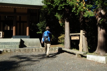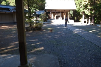 社殿の右側に入って行くと、脇で木の太さを測ってるオジサンがいたので、