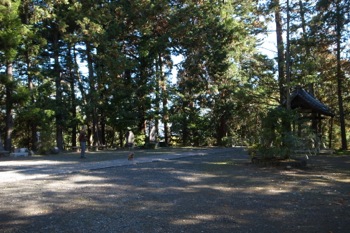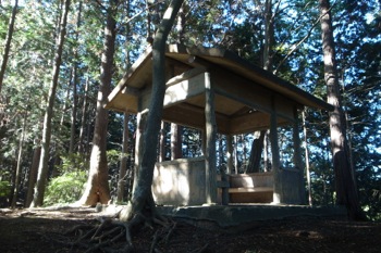 さて、社殿右を通過して森に入るとすぐに東屋。