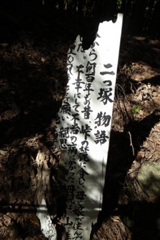 今から何百年もの昔、峠の麓に貧しい母と娘が住んでいました。不幸にして、不治の病にかかった母親は、山に生きたまま埋められることを願い、親思いの娘も、一緒に葬られることを涙ながらに願って、この地に埋められました。それ依頼、二つ塚と呼ばれ、薄幸(はっこう)の親子をしのんで、心ある村人が、掃除や土盛りをして、今も供養しているのです。