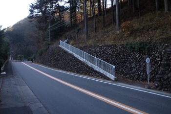 『笹平バス停』から100m程進むと、右手に緩やかなスロープが出てきますので、そこから山へ入って行きます。