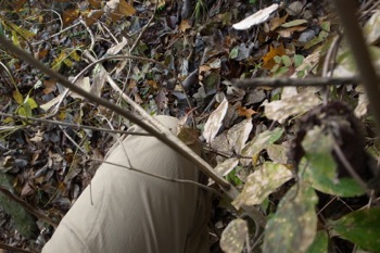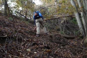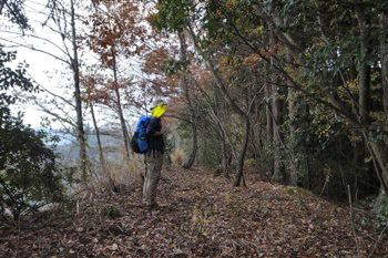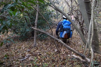 とにかく、尾根の上は、ヤブ+倒木+蔓が邪魔で歩行は極めて困難なので、 そこを外しつつ、でも大きく外れないように歩きます。