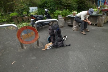 猫がベテラン風オジサンのバックパックにイタズラ中。