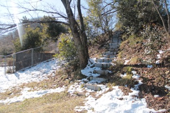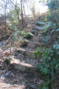 木の間を潜って、進むとすぐに目の前に小さい階段が現れます。