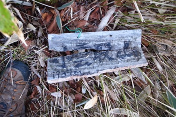 真っ二つに割れたプレートが木の根本に転がっていた。