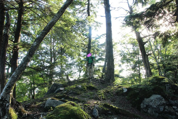 岩下谷ノ頭周辺から、コンパスで下る方向を確認してから、長沢背稜の縦走路まで下ってゆきます。