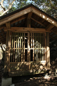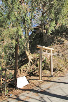 ずっと林道を歩いて行くと、左手に鳥居。頭上には小さい祠。
