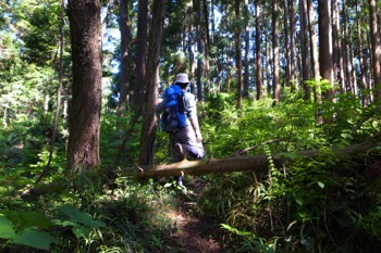 倒木を超える。