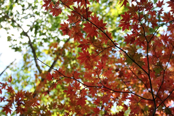 立ち止まって見上げると、赤い葉に光が透けて、とても美しいです。