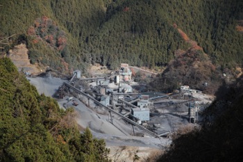 山頂からは、一部見通しが良く、下方に石灰採掘工場(?)が見える。