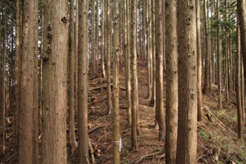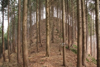 メシモリ岩山から、下を見ると、すぐそこに歩いてきた林道が見えています。