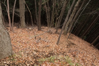 落ち葉も堆積してるし、靴のグリップが足りないので、すべるすべる!!