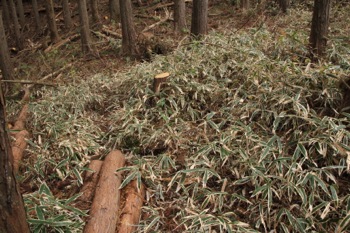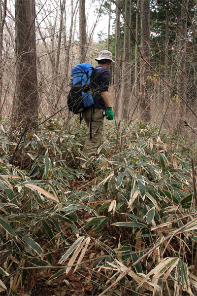山頂に近づいてくると、姫笹の原が出てくる。ここは両脇から細い枝が攻めてくるけど、 冬なのでヤブ感は薄い。