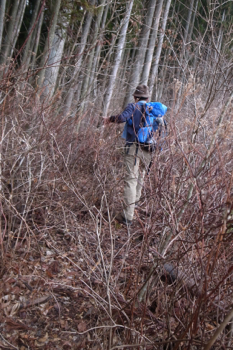 美しい針葉樹の森を抜けると、次は灌木地帯を藪こぎ気味に進む。
