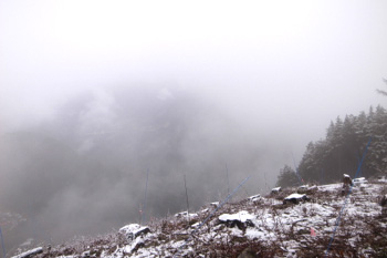 九竜山山頂目前の場所。展望が開けているが、霧が深くほとんど何も見えない。