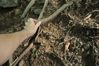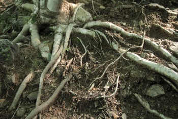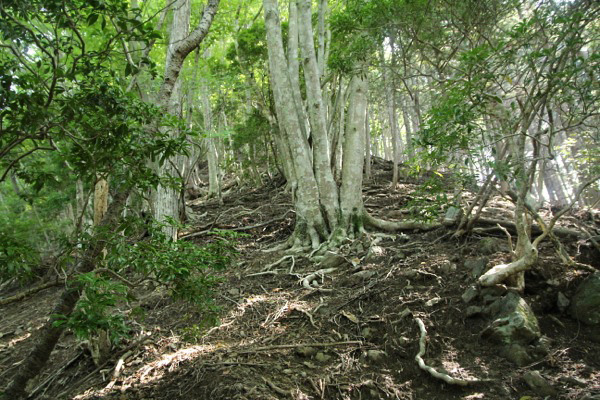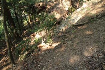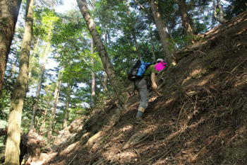 少し登ると、尾根へ取り付きやすくなったので、立木を上手く利用して尾根の上へ再接近を試みます。