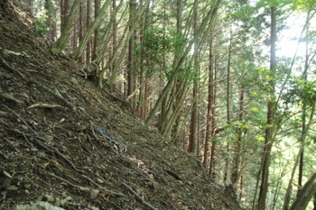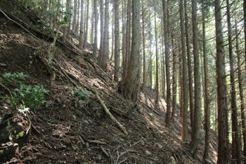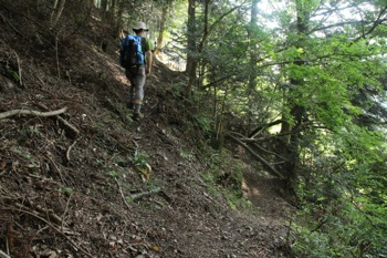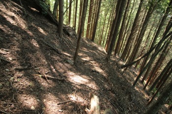 道とは言えないぐらい踏跡が薄く、土も崩れやすい斜面を横断です。