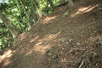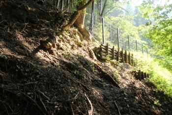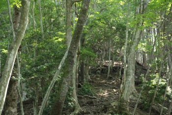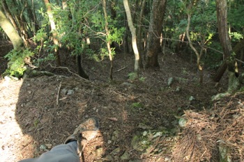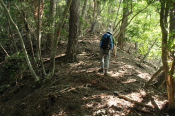 踏跡は階段から左方向へ山の斜面をトラバース気味についている。