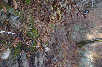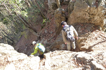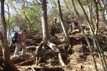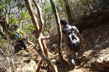 大岳山は岩がちなので、ゴツゴツした場所を下って行く。
