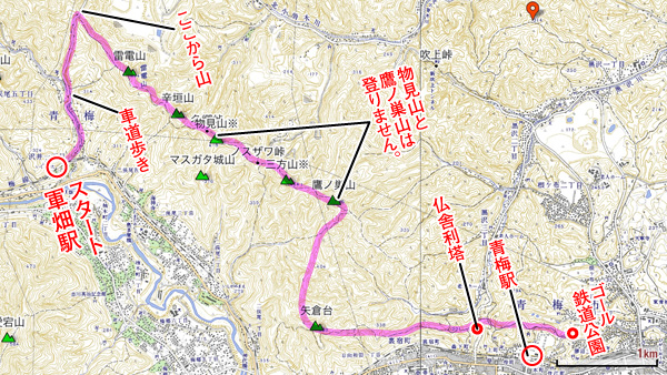 JR青梅線 軍畑(いくさばた)駅を出発点とし、雷電山からの縦走。最後は青梅駅から帰ります。