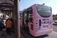 ピンク色のマイクロバスです。