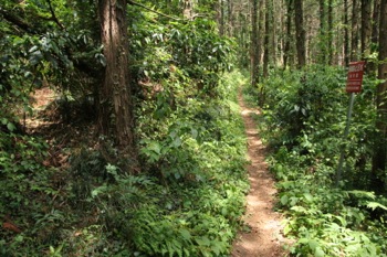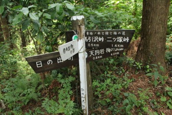道はじわじわと、高度を上げて行く感じで、体力的にきつい場所は一箇所も無い。 途中右手に赤い看板が出ていた。 道を外して左手に薄い踏み跡がある。 進む事もできたけど、今回は無視。