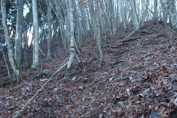 そしてついにムロクボ尾根の終端に達するのだが、その頃には傾斜もかなり厳しくなっている。