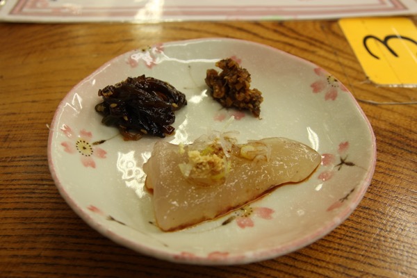 サービスで3種類の何かをたべさせてくれるみたいです。