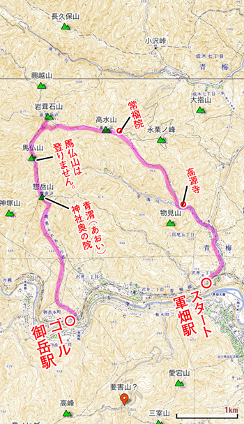 JR青梅線 軍畑(いくさばた)駅を出発点とし、高水山〜岩茸石山〜惣岳山と縦走。 JR青梅線 御嶽駅へ下ります。