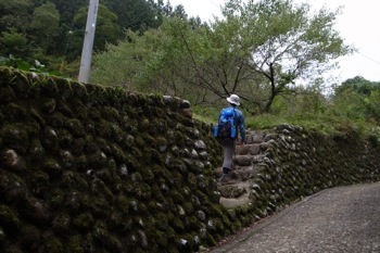 進んで行くと左手に石垣、その向こうにお墓が見える。