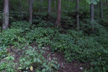 進むだけ進んで、お墓の裏へやってきて、森の中を見るけど道がありません!!
